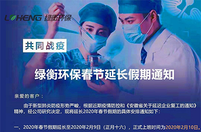 尊敬的客戶:新型肺炎防疫形勢嚴峻,結合國家防控要求,綠衡環保經研究決定春節假期延至2月9日,2月10日正式開工。全心全意為您服務,共渡難關再創輝煌。
